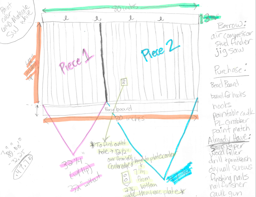 After looking at TONS of images, I decided that I needed my plan to be VERY simple so that I could complete it by myself (well pretty much), AND keep it cheap!  The problem with doing a design with 2 x 4’s (as in most of the pictures shown above) was that it would require me to remove and re-install the base board because 2×4’s are thicker than the width of our baseboards and would hang off the wall past the base board. I just didn’t have the confidence in my abilities to do that, so I narrowed it down to this plan and drew it up on paper…