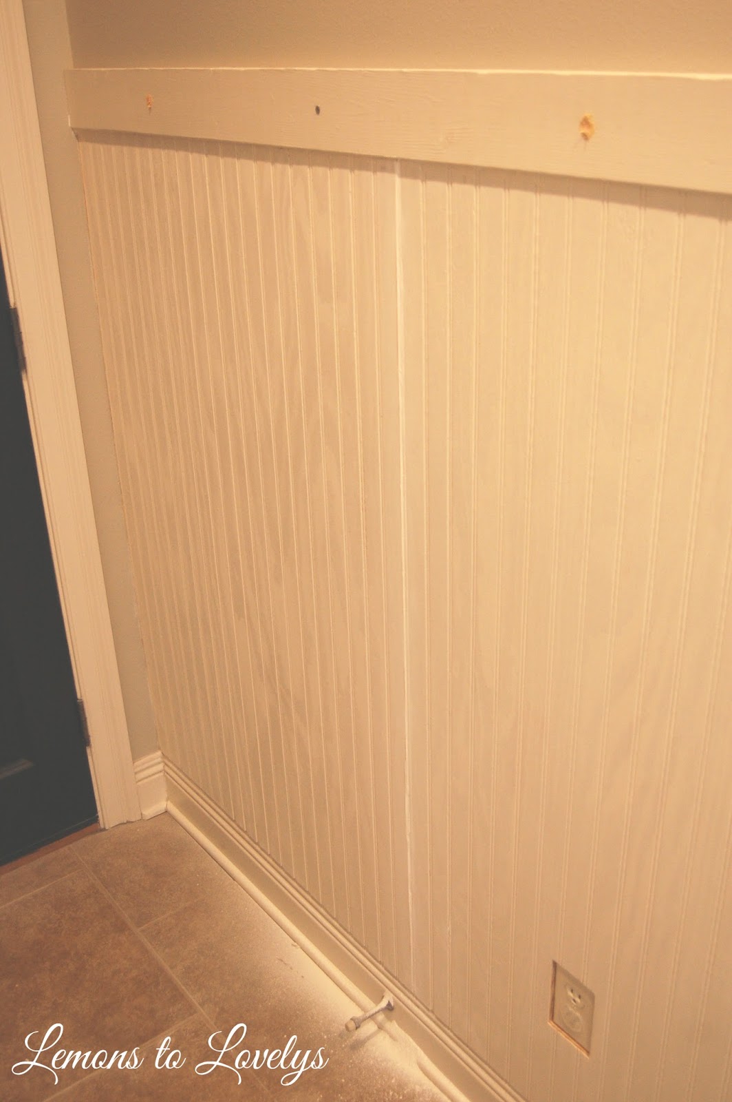 I chose bead board because it is very thin and would sit almost flush with our base boards.  (*sidenote-notice I said “almost flush”, it does have a slight lip that sits over the top of the baseboards but it is designed to hang this way.  If you are the type of person who needs everything flush, plan on adding a few inches to your length and re-installing your baseboard over the bead board to achieve a perfectly flush look)….