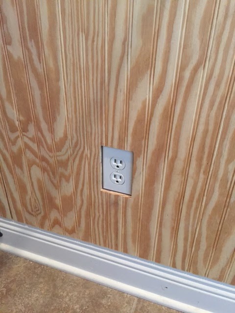 When I got the two pieces of board home, I set them up onto the wall just to make sure they fit before I did anything else.  They fit like a glove except for the darn outlet plug, which I had accounted for.  So the next step was to draw on the boards exactly where the outlet plug was going to sit, and cut a hole…