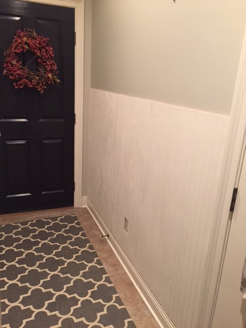 I know at first glance this probably looks very confusing so I’ll explain.  My plan consisted of using a big piece of bead board with 1 simple board on top, similar to but smaller than a 2×4 .  This system would fit perfectly across our wall to the right of the newly painted door….