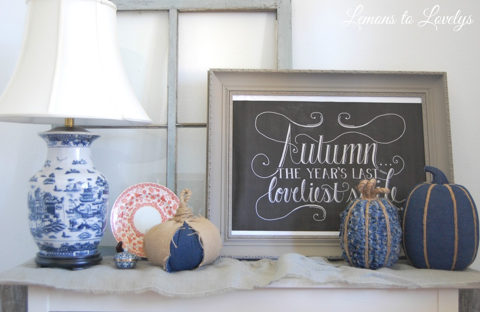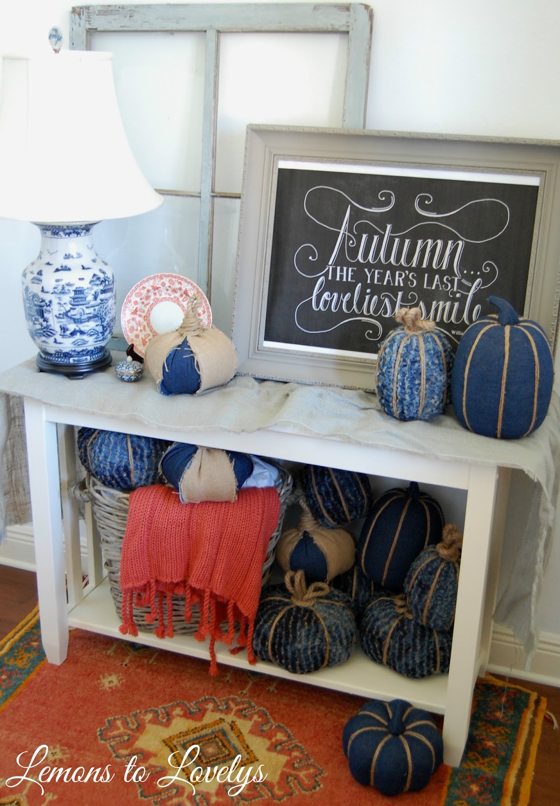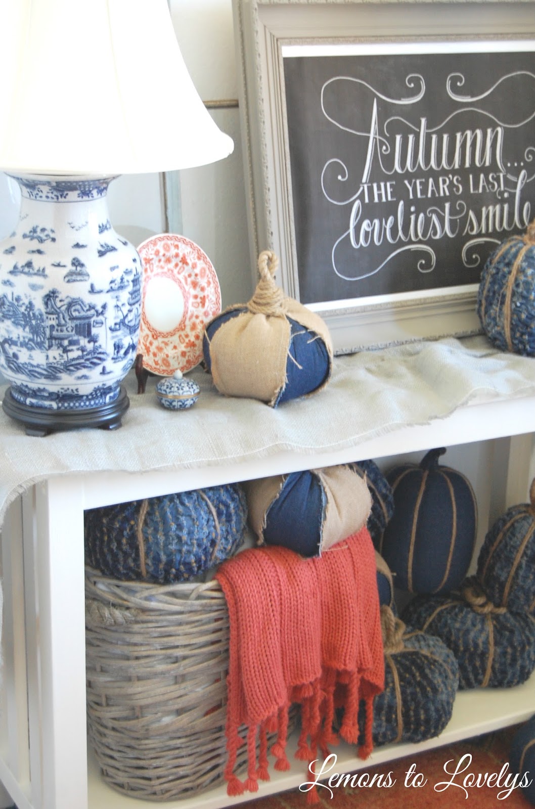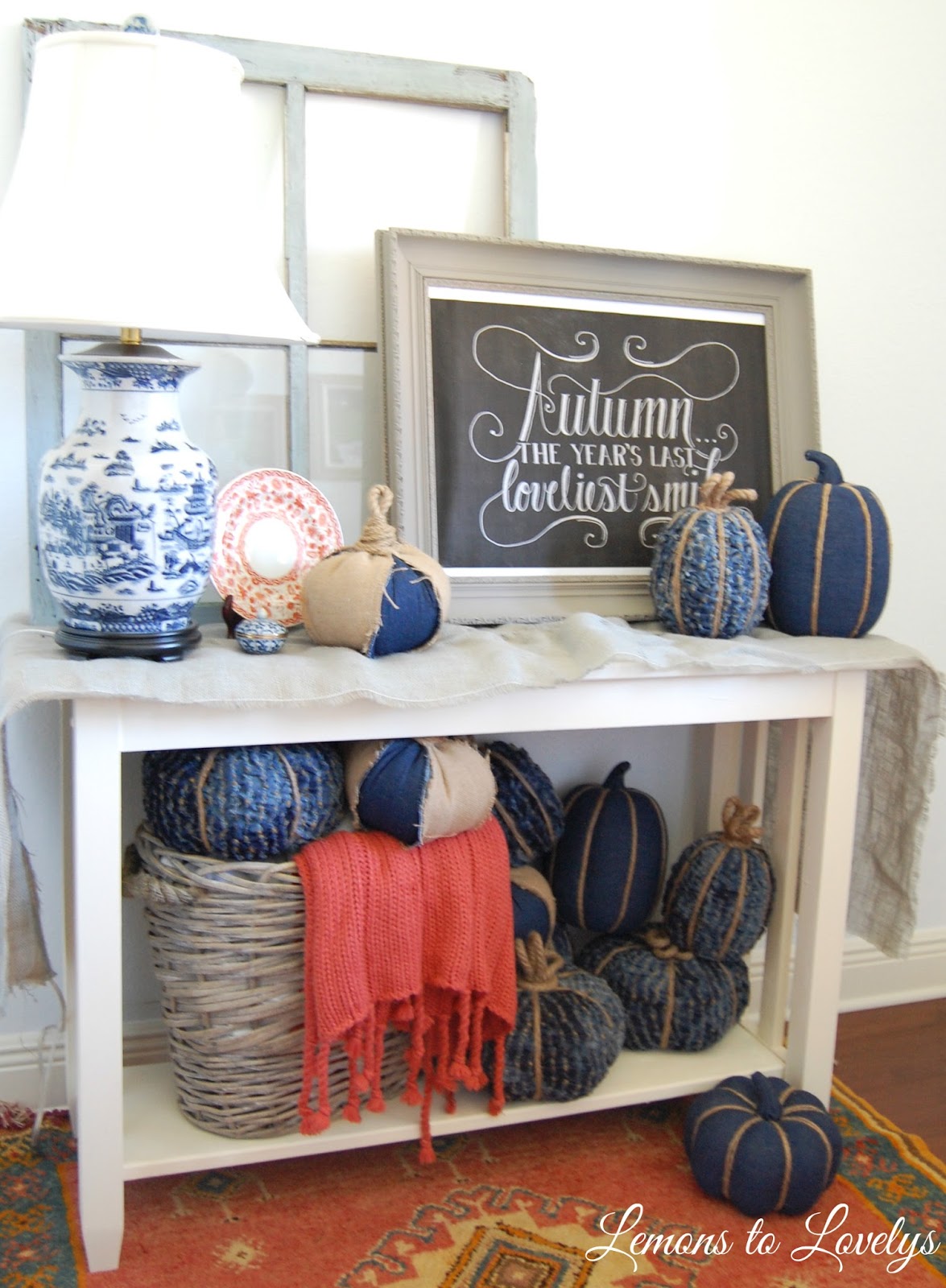 A few weeks ago I was browsing the “Fall decor” section at Hobby Lobby and saw an entire display of BLUE PUMPKINS!!!!  Tons and tons of the cutest little pumpkins in different shapes and sizes made from denim and burlap in various shades of blue!  All I could think about at that moment was my friend who had just moved to town and her entire house filled with blue, white, and coral accessories.  I had to tell her about these pumpkins!  Little did I know, 5 minutes later she would be buying EVERY SINGLE BLUE PUMPKIN Hobby Lobby had for sale.  I went over to see them on her console table the other day and added my favorite Fall sign and basket to the mix. Take a look…