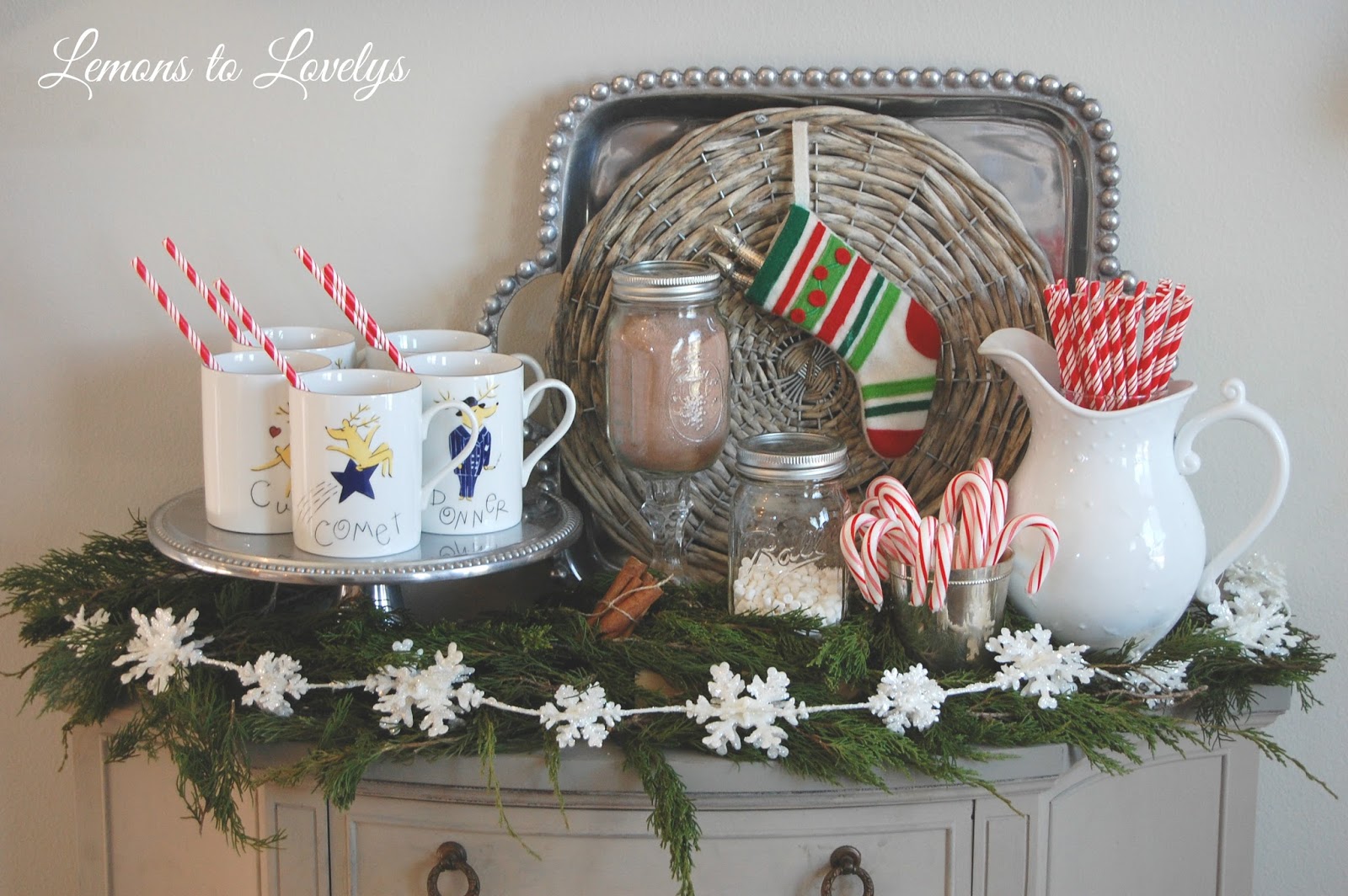 | reindeer mugs-Pottery Barn silver cake stand- wedding gift from Bed, Bath, & Beyond greenery-cut from the woods snow flake garland-Paul Michael mason jars-Dollar Tree mint julep cup-Gordon’s Home Decor white pitcher-TJMAXX red and white straws-Target silver tray-wedding gift gray wicker charger-Stone Creek Club & Spa Gift Shop silver ware stocking-Crate & Barrel Outlet candy canes-Walmart cinnamon sticks-spice section of any grocery store |