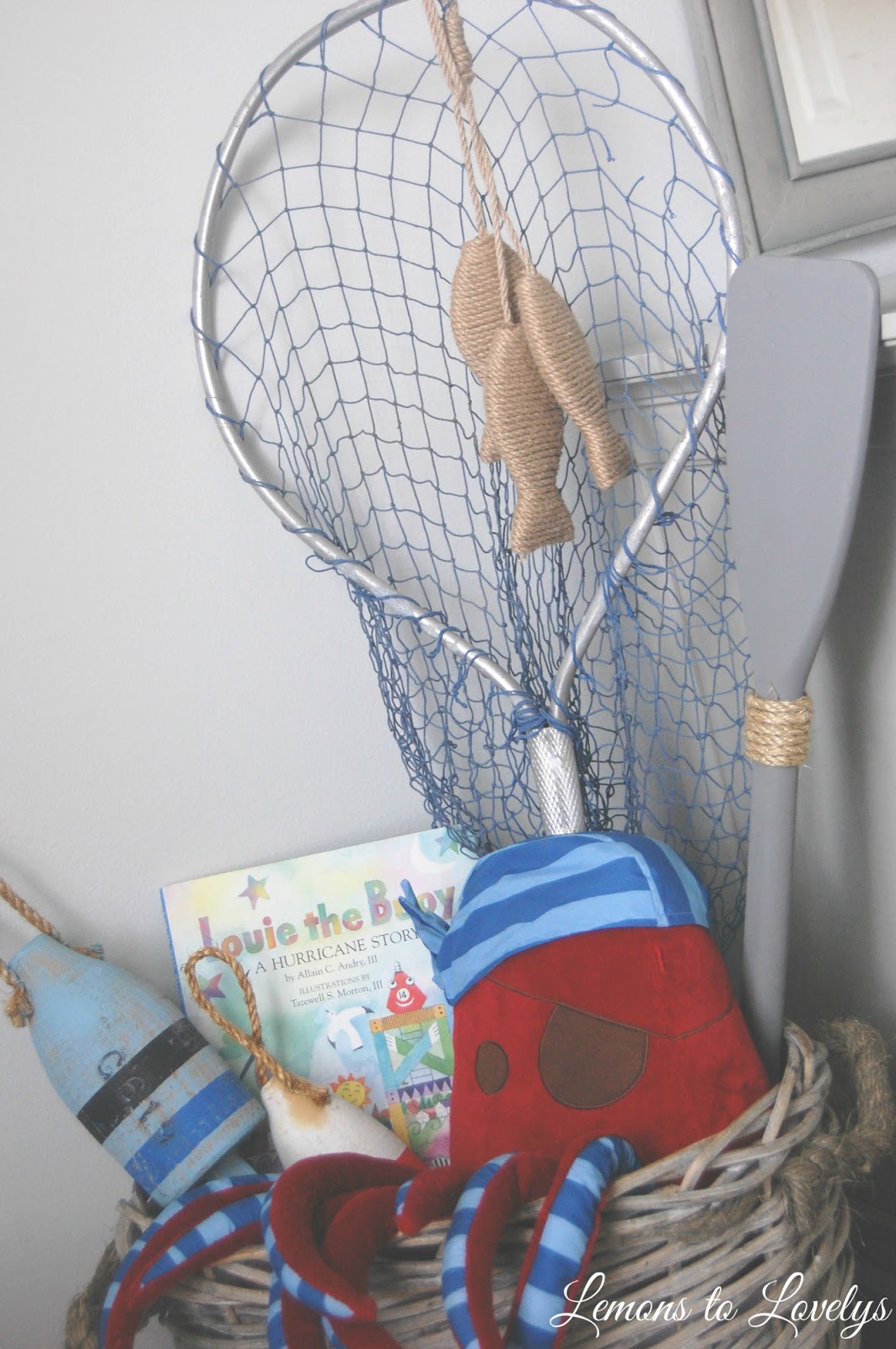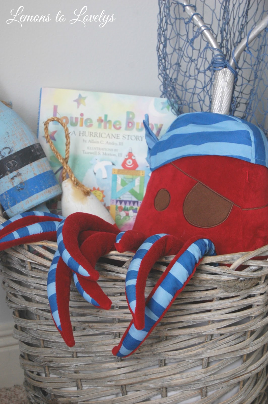 | basket-Paul Michael decorative bouies-Patina Interiors Consignment Store (originally Homegoods) octopus pillow-Target sisal fish stringer-Kirklands net-found in our garage (Academy) |
