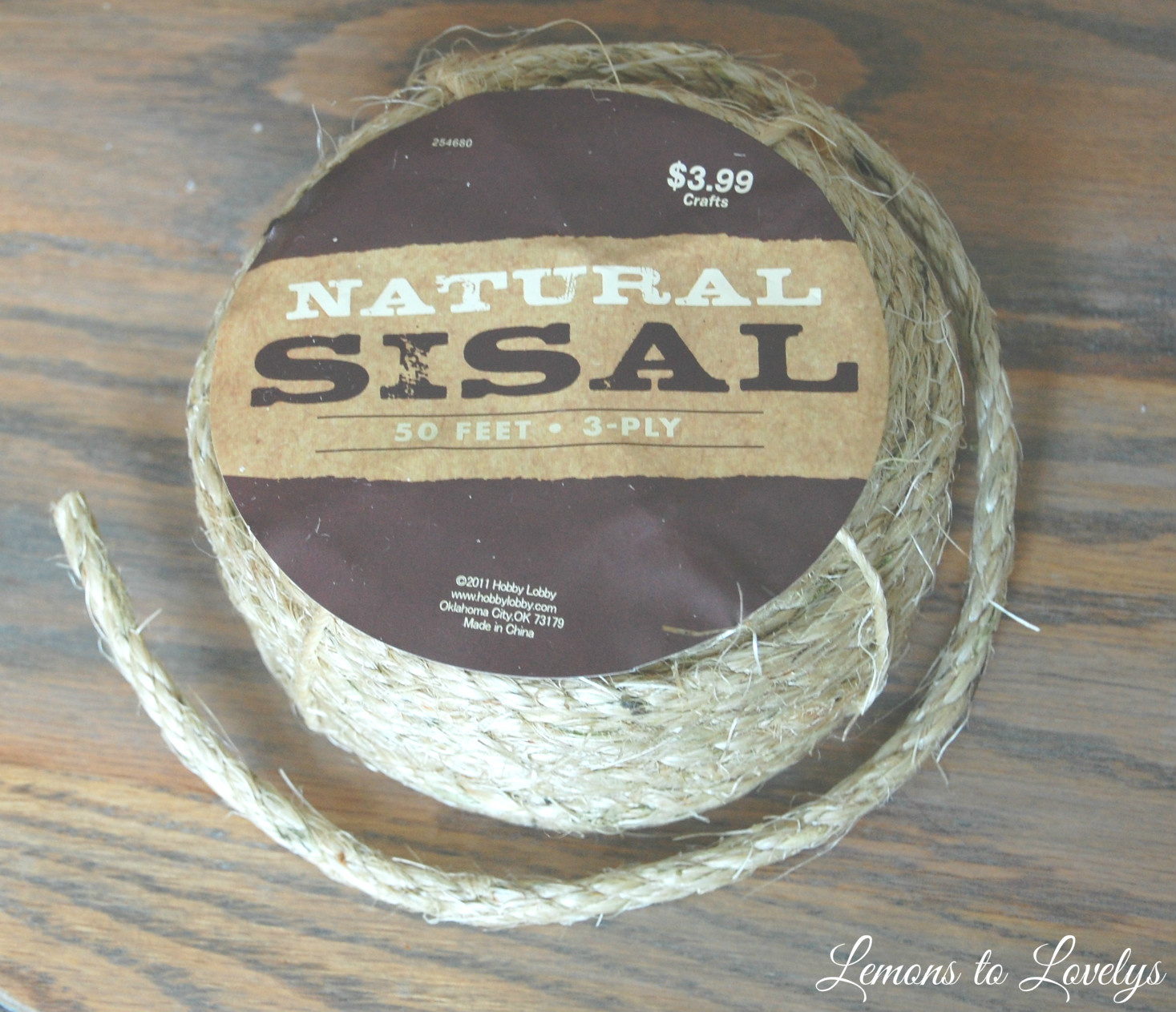 Then I got some Sisal rope to add to the handle. I decided to go with the 3 ply Sisal instead of twine because I liked the look better. Sisal is a little bit lighter in color than twine. I found it at Hobby Lobby for half off of $3.99 and had a TON left over by the time I was done.