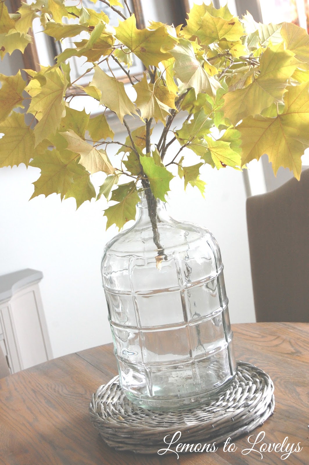 As my toddler and I were running errands, I passed by some BEAUTIFUL trees that are starting to turn colors and I had to stop and cut a few branches down to make arrangements in our house. These maple leaves are the perfect foliage that I was looking for to add to our kitchen bar and kitchen table…