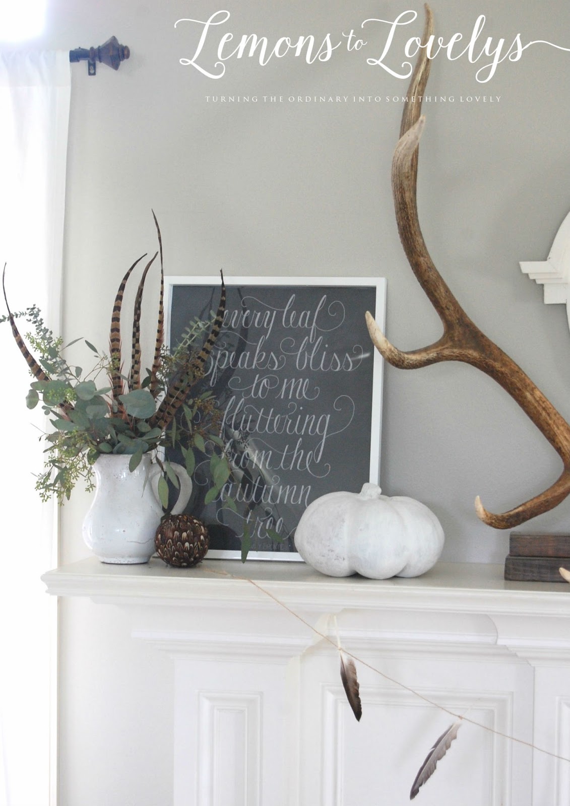 This year I decided to do something a little different and place all of my Dear Lillie chalkboard prints together on the fireplace mantel. I also added in a few cinderella pumpkins this year and whitewashed a couple of faux pumpkins and squash to add to the mix. Of course the elk horns remain a staple year round on our fireplace mantel but I did change the mirror centered in the middle. It use to be a greenish grey color which was pretty but I was ready for a totally neutral Fall look so I painted it a combination of Vintage White and Dover Whitewash both by CeCe Caldwell.