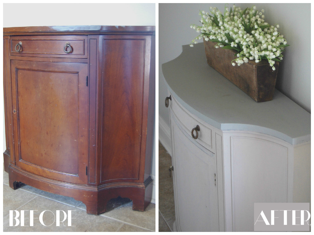Today I have a quick post about an easy furniture makeover that I did recently in our back hallway.  We needed a sort of “catchall” in this area of our house for keys, sunglasses, hats, etc.  but due to the limited amount of space, it needed to be something very thin.  Ideally, I would love to have a house with a “stop and drop” or a mudroom with cubbies by the backdoor, but that will have to be down the road.  So instead, I painted a piece of furniture that my in laws were getting rid of.  This antique “bow front cabinet” just so happened to be the PERFECT size for this area of the house and exactly what we needed….