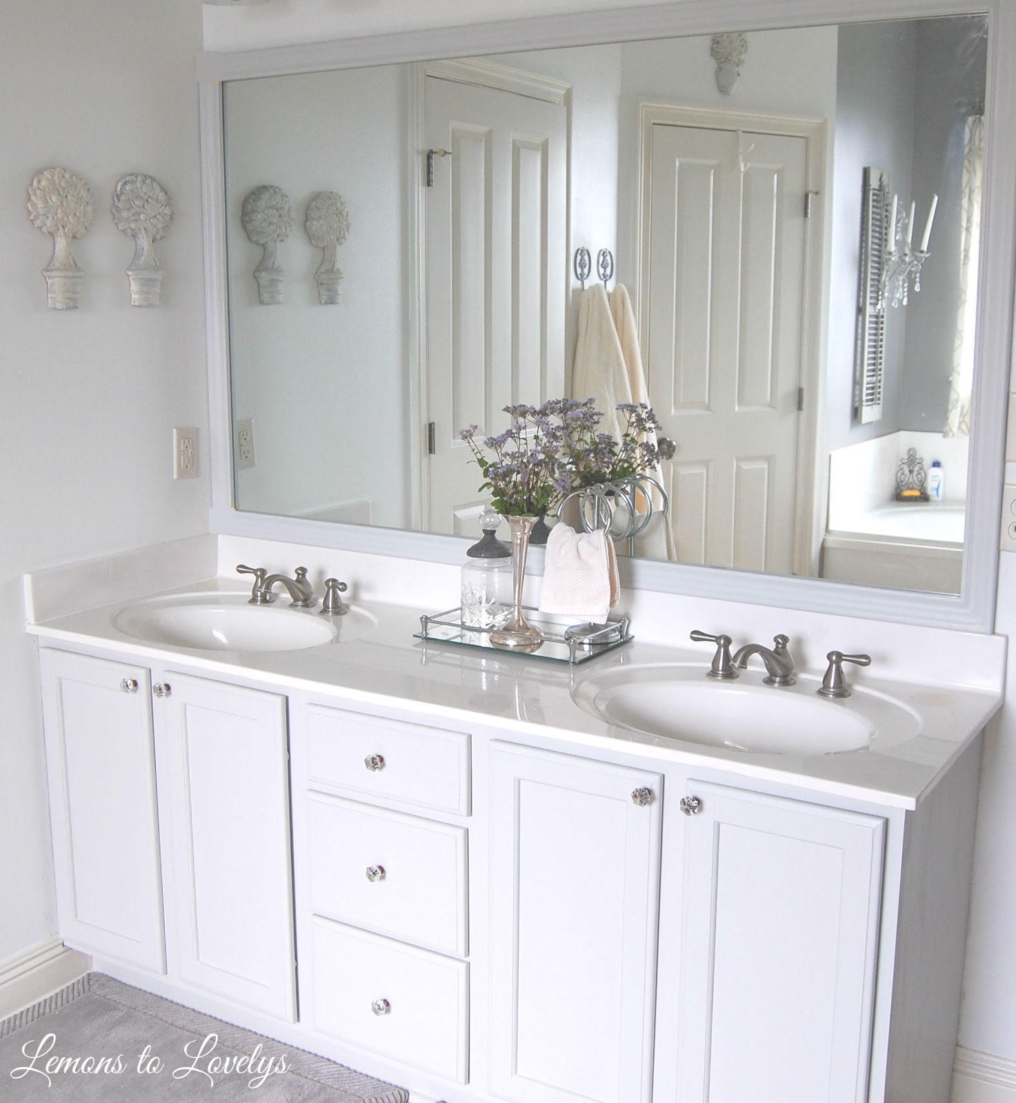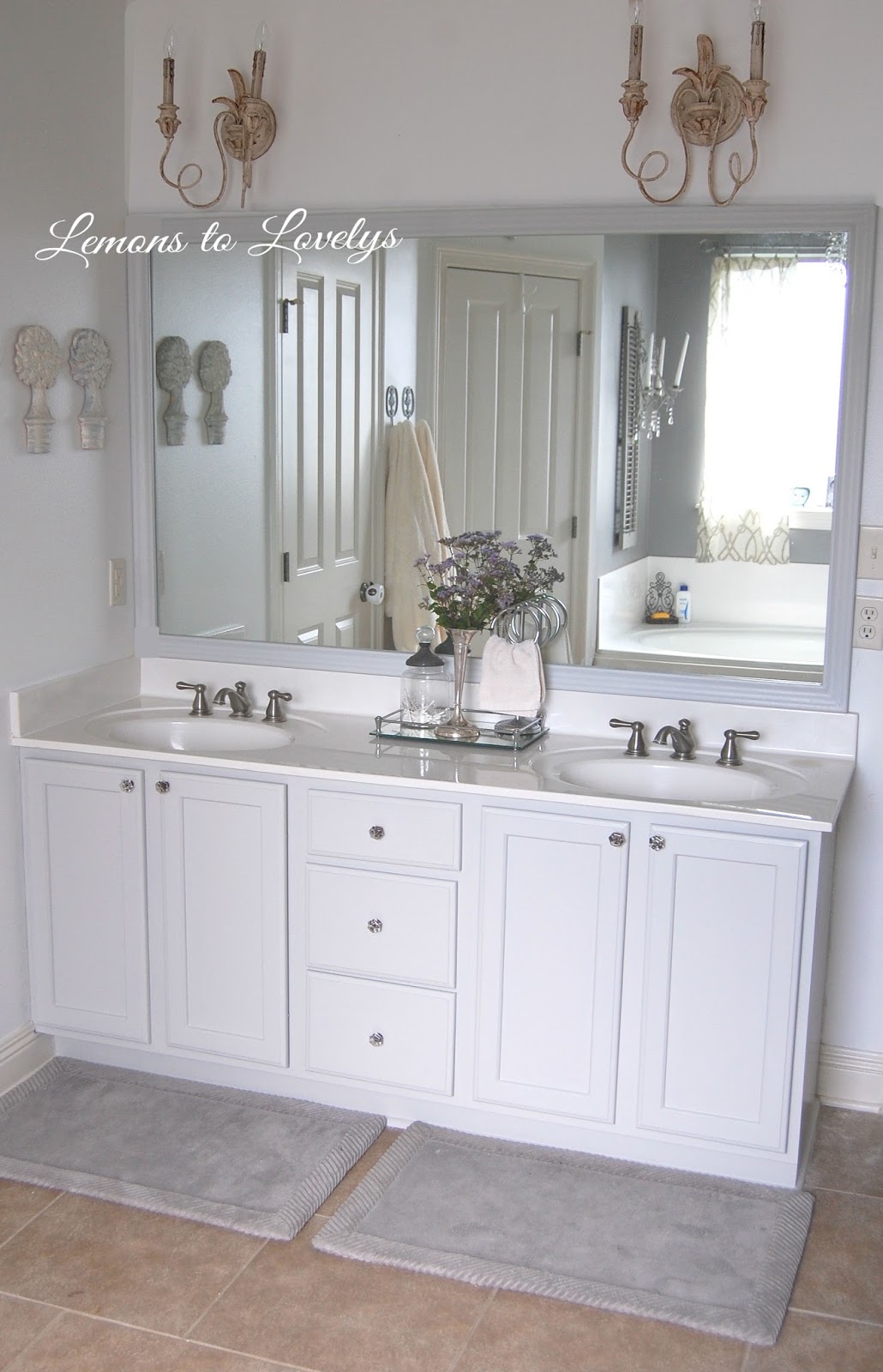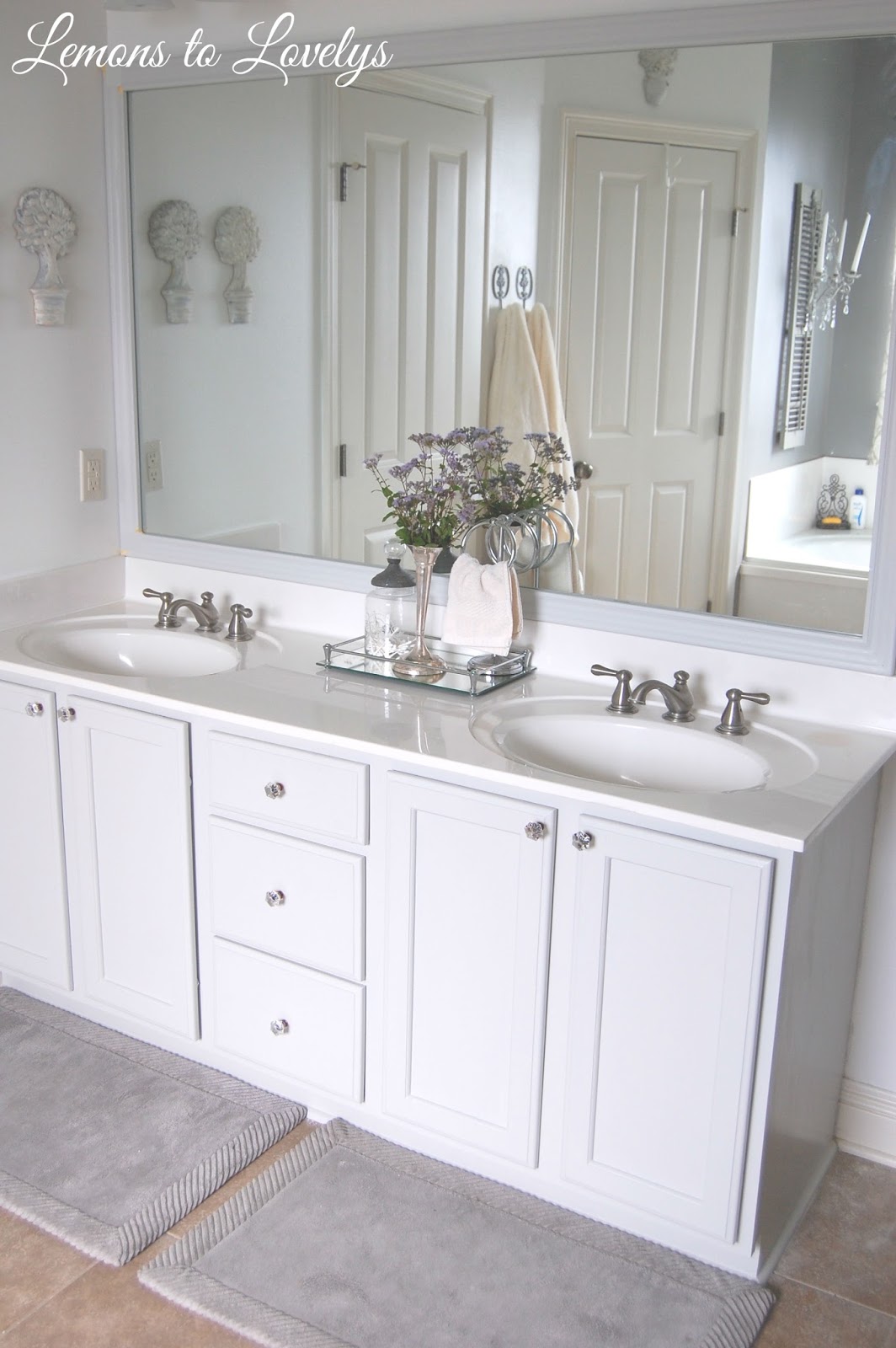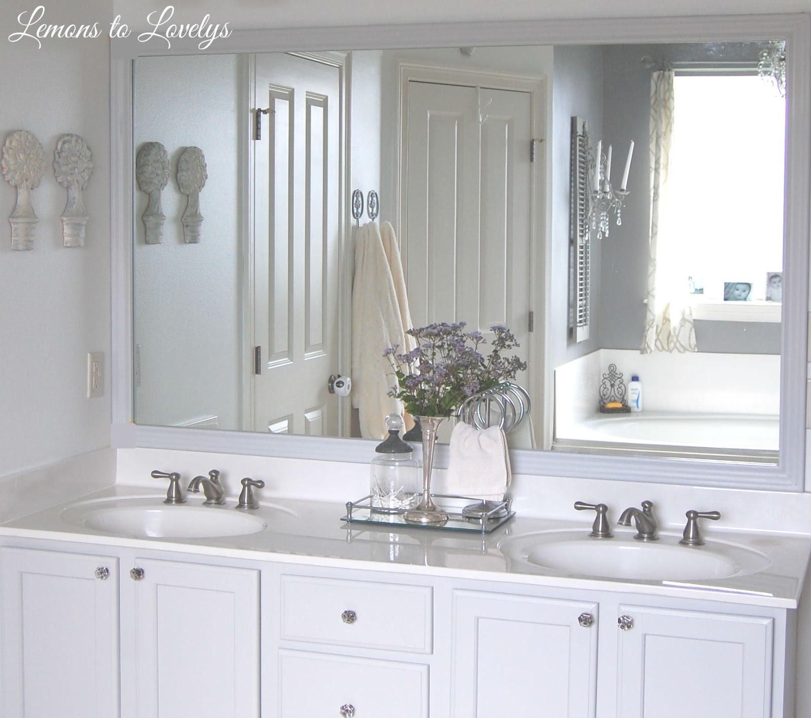 I love the whiteness of your "new" bathroom. White rooms are fantastic canvases, ready to take all kinds of color and texture from artwork, towels and fixtures. Your mirror now looks complete with a frame, a finished piece that fits well above your vanity. I bet that the room seems bigger now, with all the airy whiteness.