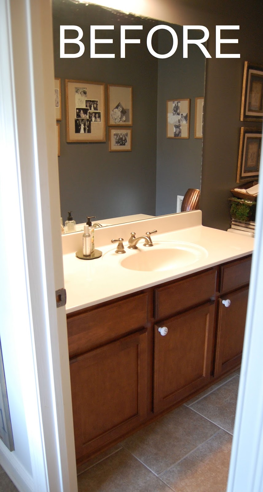 I really wish I had a true “before” picture to show you of our master bath. I am kicking myself for not taking one before I started this project! I could have sworn that I had one on my camera but I can’t seem to find it anymore. So, you’ll just have to use your imagination when I tell you what the “before” looked like. This is a picture of the sink/vanity in our half bath which is exactly what our master bathroom sink area use to look like except with a double sink…