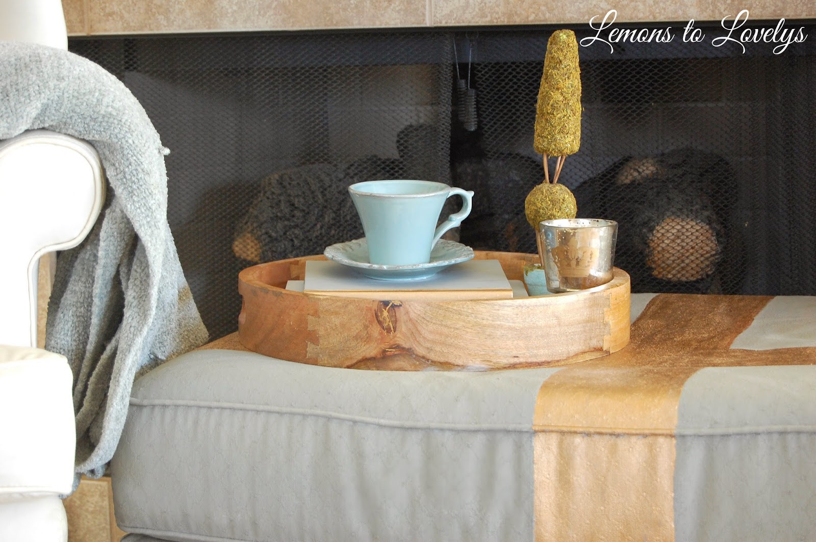 I loved the 2 colors together (Paris Gray and Silver) but it didn’t achieve the look I was going for after I placed the ottoman in front of the fire place. So, I decided to repaint it with French Linen and Classic Gold. Here are some finished pictures and detail shots…