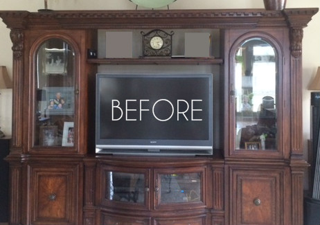 My friend Jenni (same Jenni whose office I decorated back in March. If you missed that post click here) wanted to paint her media center and redo the decor inside the shelves as her summer project. She sent me a “before” picture of the piece and asked what color to paint it…