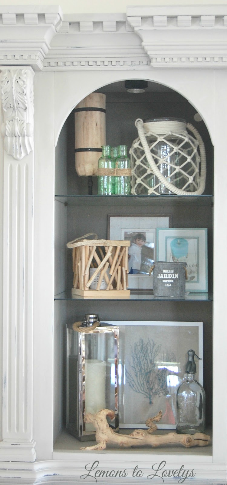 Here are some pictures of the shelves I styled for them. ALL of the decor is from Homegoods...