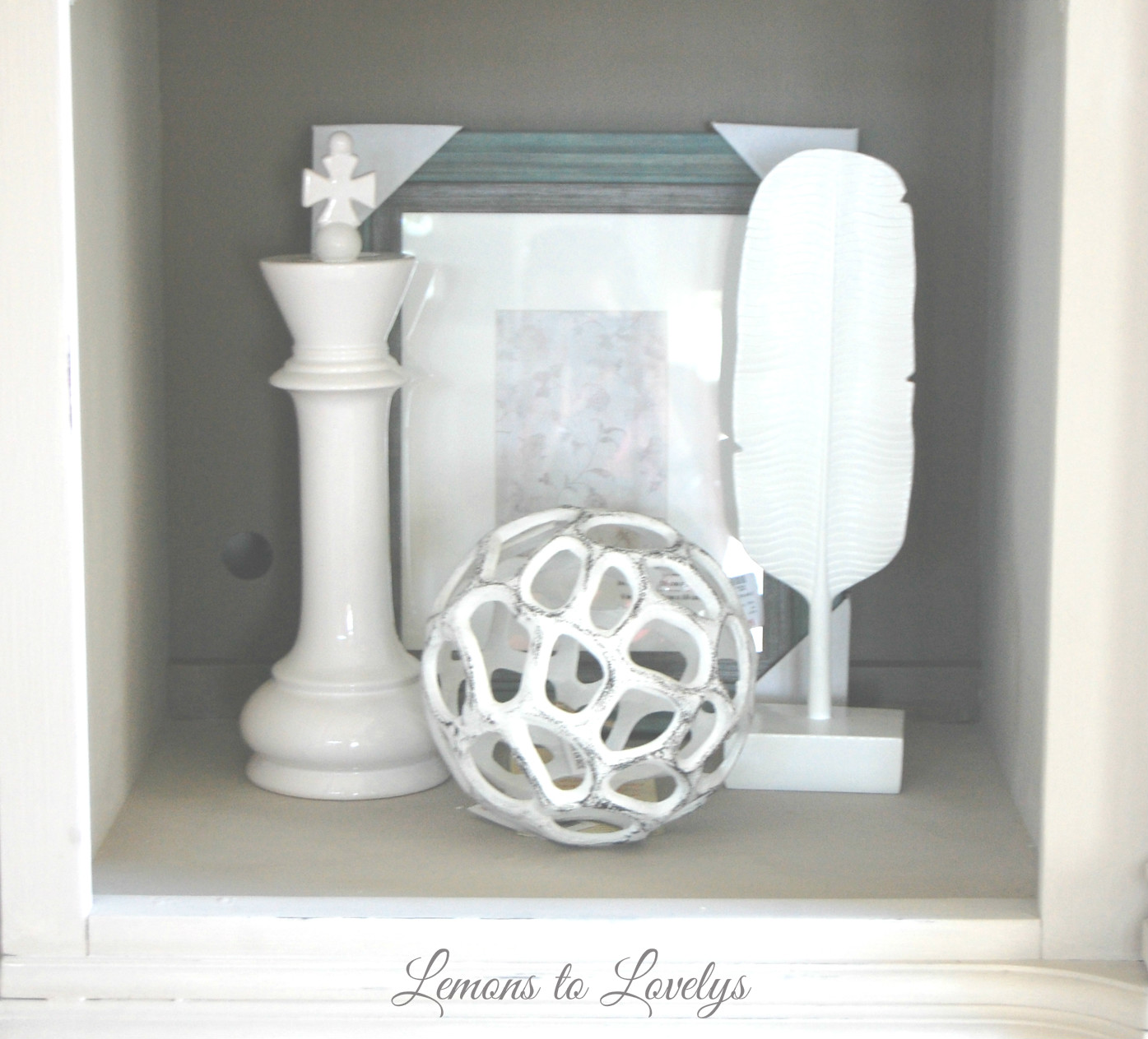 I suggested Young Kansas Wheat by CeCe Caldwell’s because it is my new favorite neutral paint color for furniture.  I painted my master bedroom, china cabinet, and back hallway piece with it and was very pleased!!!  They ended up mixing Young Kansas Wheat and Vintage White, both by CeCe Caldwell’s.  The color is a tad lighter and it looks beautiful!!!  I also suggested that they paint the back, inside wall of the shelves a different and darker color so that the new decor would be more noticeable with a contrast.  For the inside, they used a color called Anonymous by Behr because it was leftover from another project.  When they were all done painting, I came over for the fun part!!!