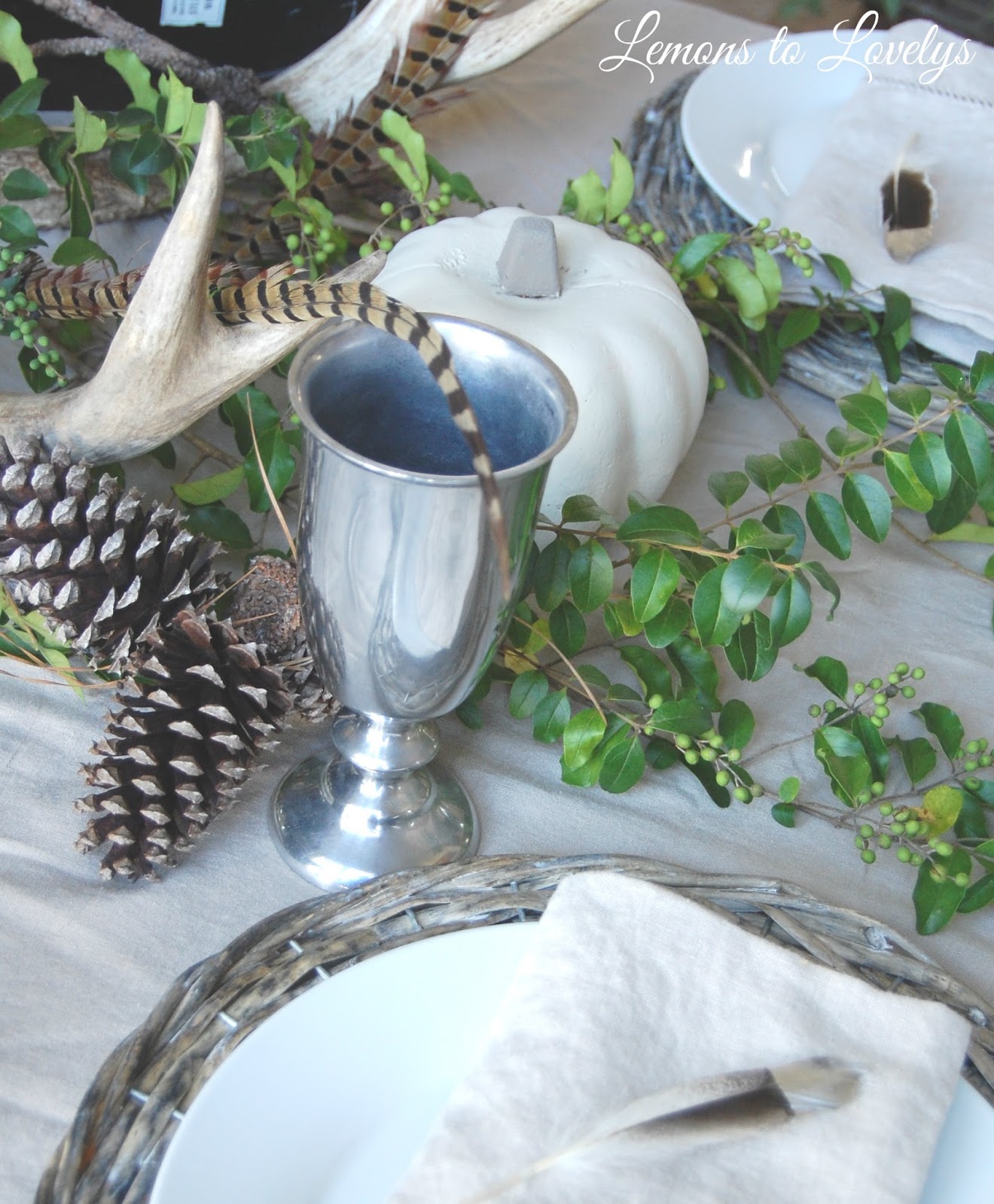 I’m a little late in blogging about my Thanksgiving tablescape because I’ve been up to my elbows in painting cabinets!!!  Plus its been SO hot here, I found it hard to get motivated.  But, I finally pulled it together.  I hope you can find some inspiration!  I decided to use a lot of natural elements and greenery this year..